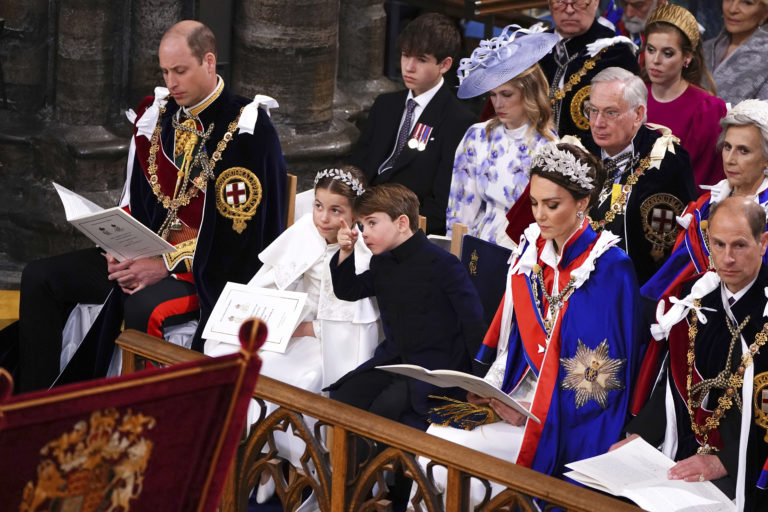 Zľava 1. rad: britský princ William, princezná Charlotte, princ Louis, Kate princezná z Walesu a princ Edward vojvoda z Edinburghu na ceremónii korunovácie kráľa Karola III. vo Westminsterskom opátstve, Londýn, sobota 6. mája 2023. Foto: SITA/AP