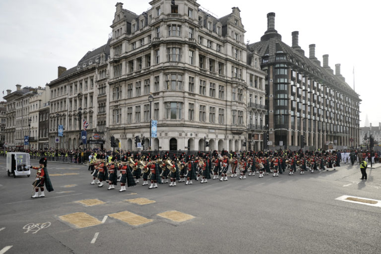 Vojaci pochodujú pred Westminsterským palácom pred korunovačným ceremoniálom britského kráľa Karola III. v Londýne, v sobotu 6. mája 2023. Foto: SITA/AP