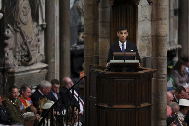 Britský premiér Rishi Sunak má prejav počas korunovačného ceremoniálu britského kráľa Karola III. a kráľovnej Camilly. Foto: SITA/AP