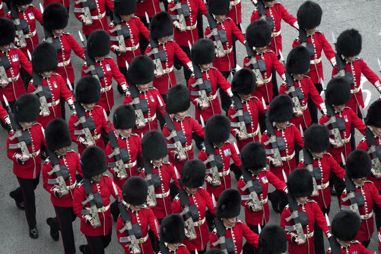 Vojenská jednotka Coldstream Guards pochoduje pred korunováciou britského kráľa Karola III. v Londýne, sobota 6. máj 2023. Foto: SITA/AP