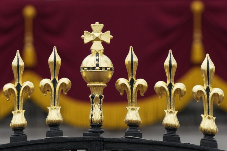 Zlatá ozdoba v tvare koruny na vrchole brány do Buckinghamského paláca. Foto: SITA/AP