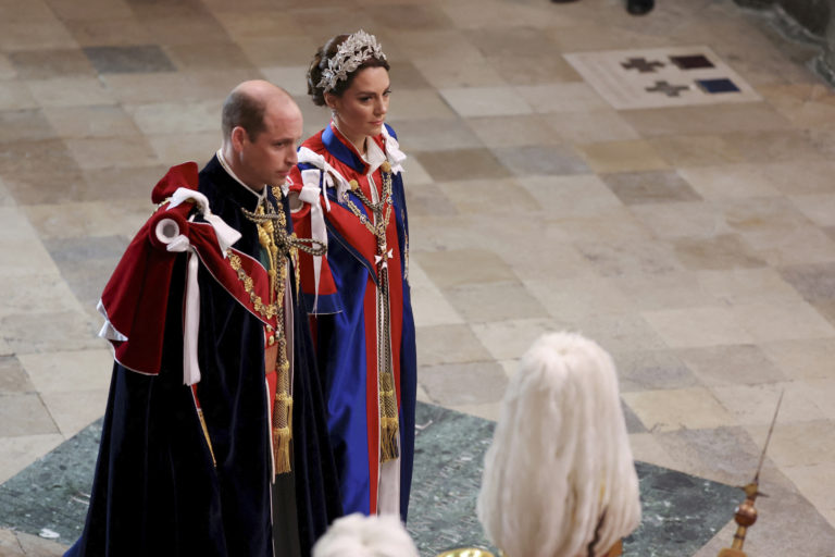 Britský princ William bozkáva svojho otca kráľa Karola III. počas jeho korunovačného ceremoniálu. Foto: SITA/AP