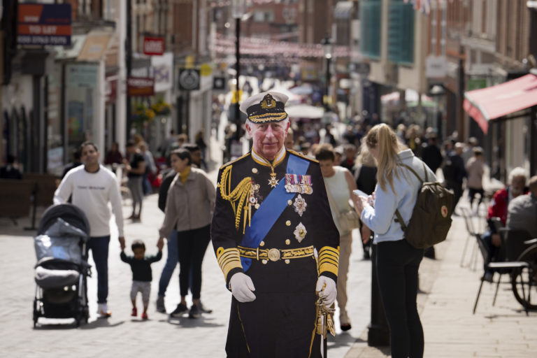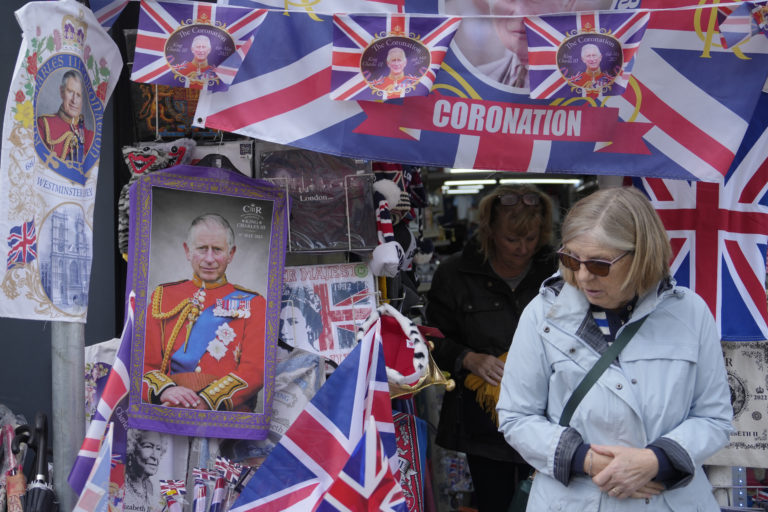 A cutout of King Charles III stands outside a souvenirs shop in Windsor, Friday, May 5, 2023. The Coronation of King Charles III will take place at Westminster Abbey on May 6. (AP Photo/Vadim Ghirda) Foto: SITA/AP