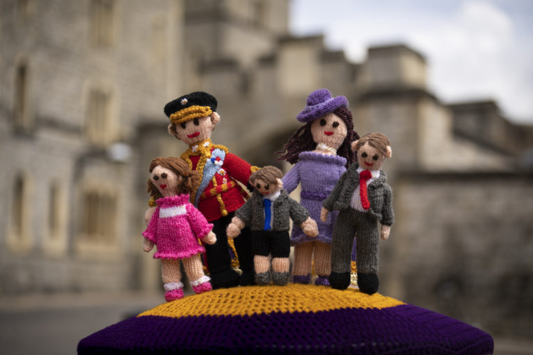 Hačkované figúrky zobrazujúce princa Williama a jeho rodinu sú umiestnené na poštovej schránke vo Windsore v piatok 5. mája 2023. Foto: SITA/AP