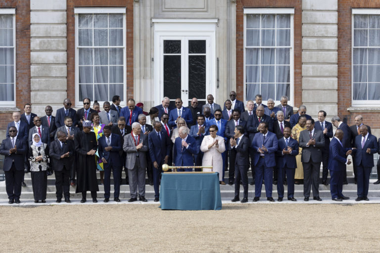 Britský kráľ Charles III a premiér Rishi Sunak pózujú na skupinovej fotografii s vodcami Commonwealthu v Marlborough House v Londýne, piatok 5. mája 2023. Foto: SITA/AP