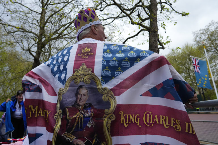 Muž s vlajkou a korunou čaká na korunováciu kráľa Karola III. Foto: SITA/AP