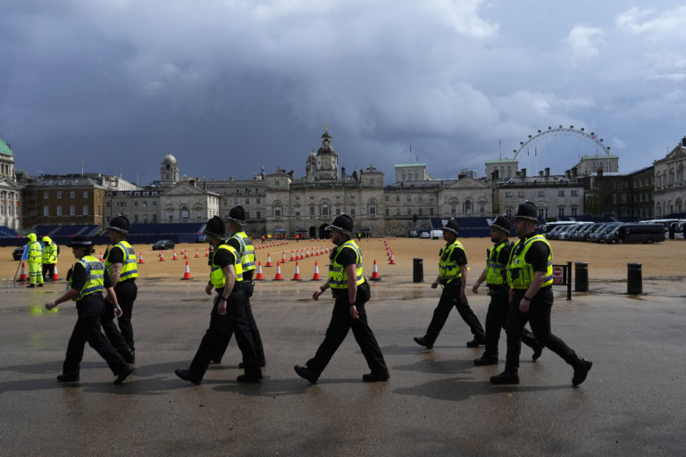 Policajti stoja na ulici pred Westminsterským palácom pred ceremóniou korunovácie britského kráľa Karola III. v Londýne, v sobotu 6. mája 2023. Foto: SITA/AP