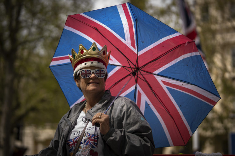 Fanúšikovi kráľovskej rodiny majú na sebe oblečenie so vzorom vlajky Spojeného kráľovstva. Foto: SITA/AP