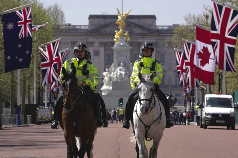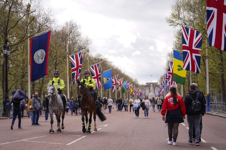 Policajti na koňoch hliadkujú v uliciach pred korunováciou britského kráľa Karola III. v Londýne, v sobotu 29. apríla 2023. Foto: SITA/AP