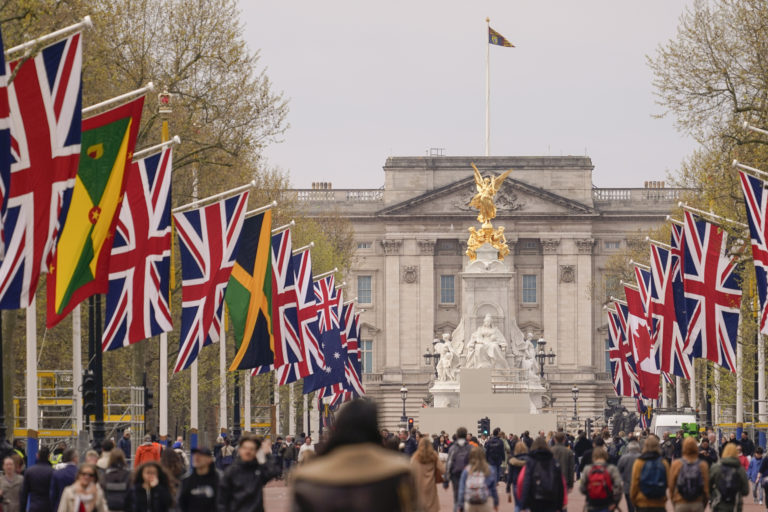 Ľudia sa prechádzajú pred Buckinghamským palácom pred korunováciou britského kráľa Karola III. v Londýne, v sobotu 29. apríla 2023. Foto: SITA/AP