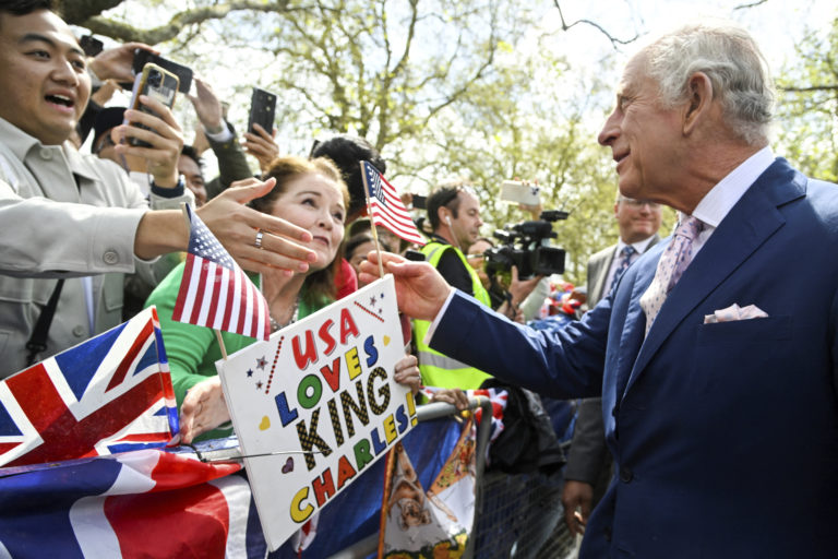 Britain's King Charles III greets wellwishers outside Buckingham Palace, in London, Friday, May 5, 2023 a day before his coronation takes place at Westminster Abbey. (James Manning/PA via AP) Foto: SITA/AP