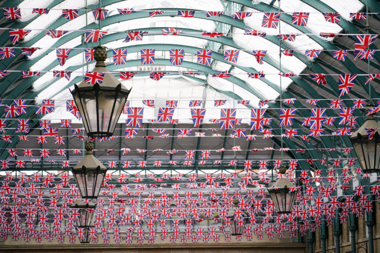 Vlajky sú vyvesené na Covent Garden Market pred korunováciou britského kráľa Karola III. v Londýne, piatok 28. apríla 2023. Foto: SITA/AP