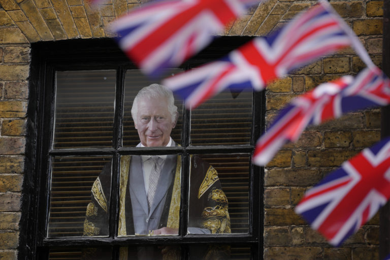 Fotka kráľa Karola III. v okne miestneho podniku. Foto: SITA/AP