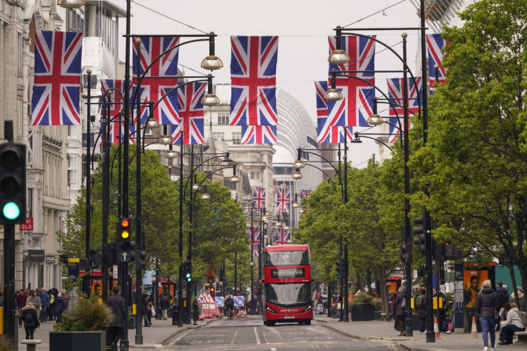 Vlajky visia nad Regent Street pred korunováciou britského kráľa Karola III. v Londýne, štvrtok 27. apríla 2023. Foto: SITA/AP