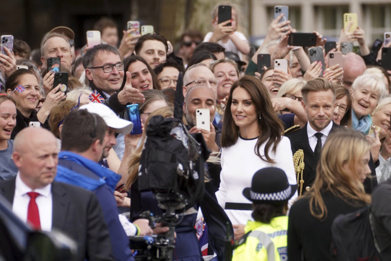 Kate, princezná z Walesu, pozdravuje priaznivcov pred Buckinghamským palácom v Londýne v piatok 5. mája 2023, teda deň pred korunováciou kráľa Karola III. a Camilly, kráľovnej manželky. Foto: SITA/AP