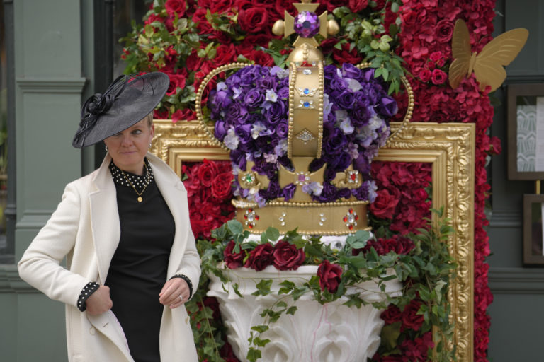 Žena pózuje pri kvetinovej ozdobe koruny, vyrobenej na korunováciu kráľa Karola III. vo Windsore, piatok 5. mája 2023. Foto: SITA/AP