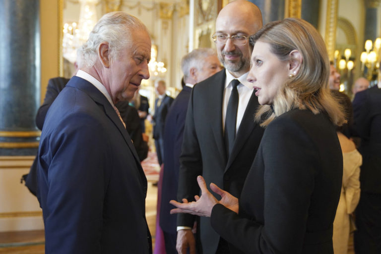 Britský kráľ Karol III. (vľavo) hovorí s prvou dámou Ukrajiny Olenou Zelenskou a predsedom vlády Ukrajiny Denysom Šmyhalom počas recepcie v Buckinghamskom paláci v Londýne pre zahraničných hostí, ktorí sa zúčastňujú jeho korunovácie. Foto: SITA/AP