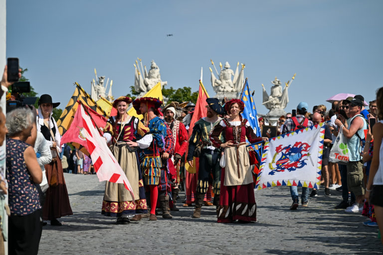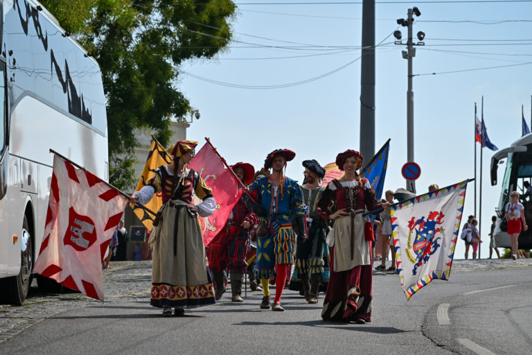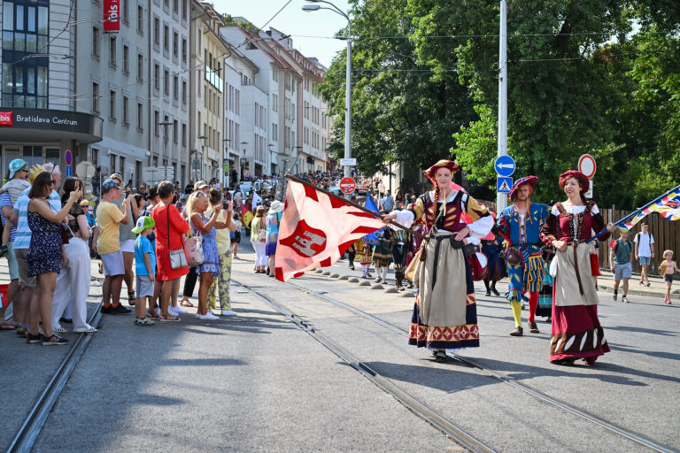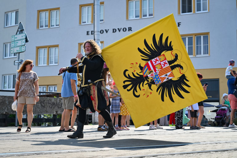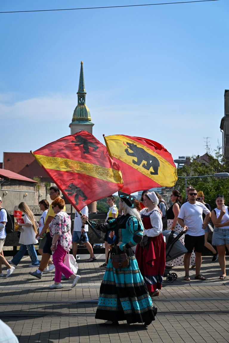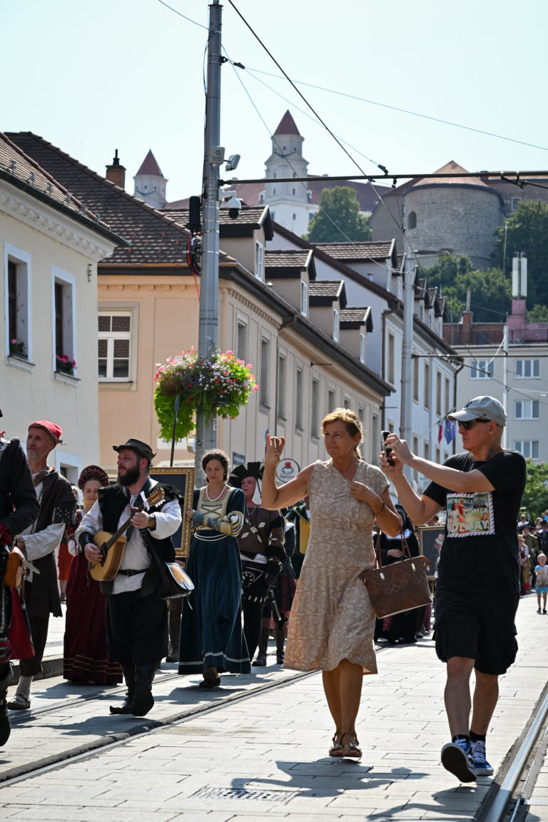 Korunovačný sprievod vo vyšperkovaných historických kostýmoch ulicami Bratislavy počas Bratislavských korunovačných dní. Bratislava, 17. august 2024. Foto: SITA