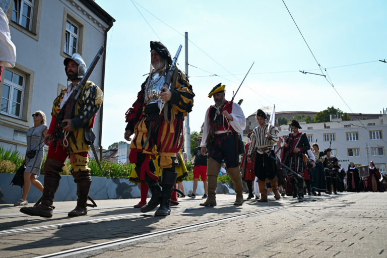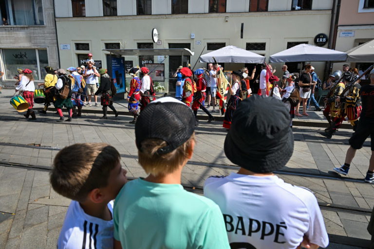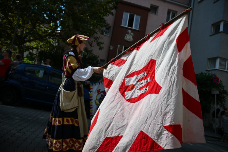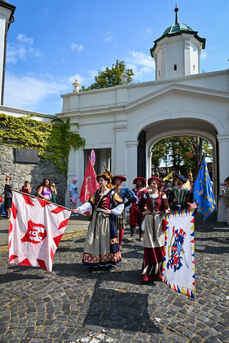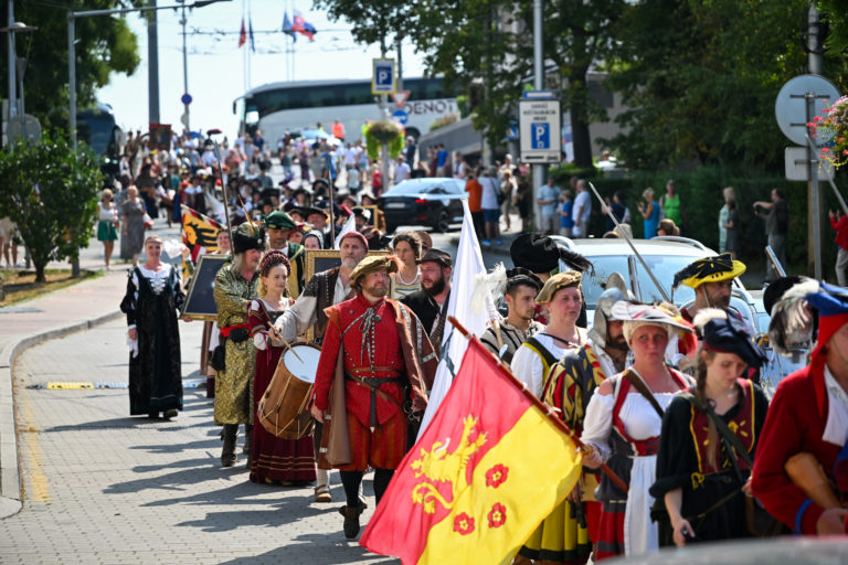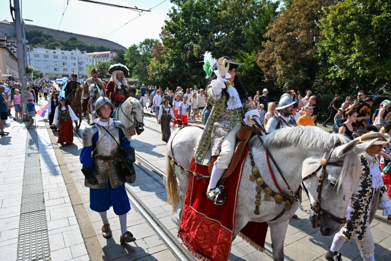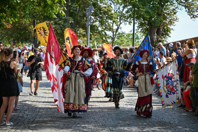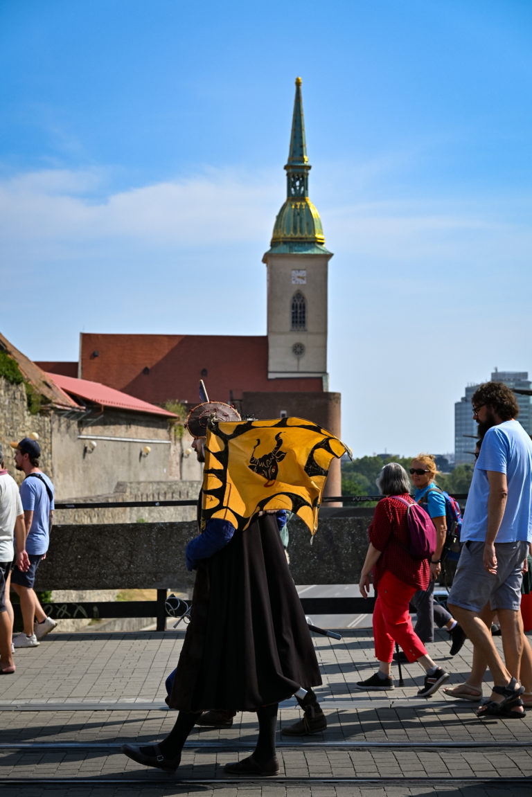 Korunovačný sprievod vo vyšperkovaných historických kostýmoch ulicami Bratislavy počas Bratislavských korunovačných dní. Bratislava, 17. august 2024. Foto: SITA