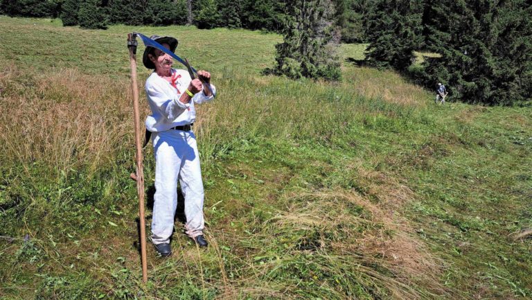 Kosec ostrí kosu počas piateho ročníka kosenia Kopaneckých lúk v Slovenskom raji. Kopanecké lúky, Slovenský raj, 11. august 2023. Foto: SITA/Mária Frisová.