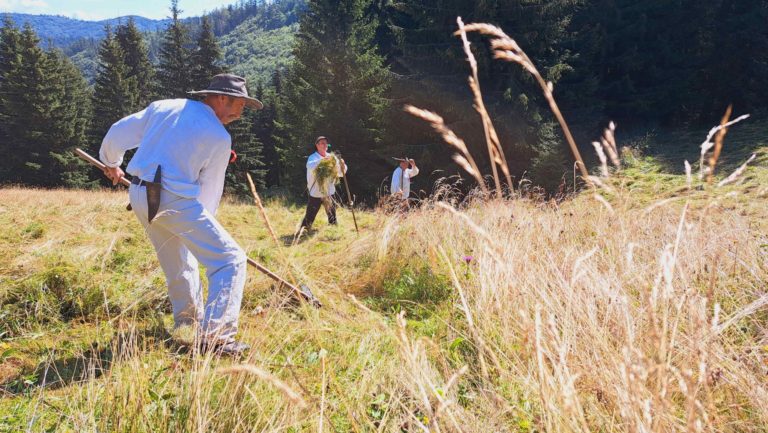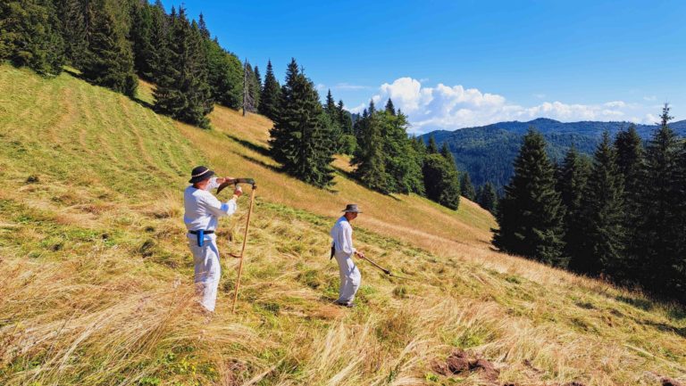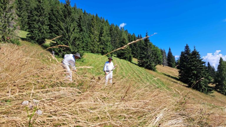 Kosci počas piateho ročníka kosenia Kopaneckých lúk v Slovenskom raji. Kopanecké lúky, Slovenský raj, 11. august 2023. Foto: SITA/Mária Frisová.