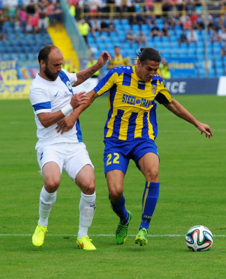 Zľava: Lukáš Hroššo z Liberca a Ajdin Redžič z Košíc v prvom zápase 2. predkola Európskej ligy medzi MFK Košice - Slovan Liberec. Košice, 17. júl 2014. Foto: SITA//Ivan Fleischer