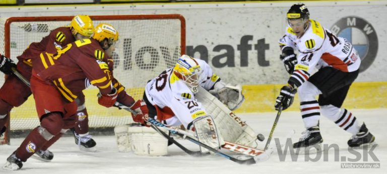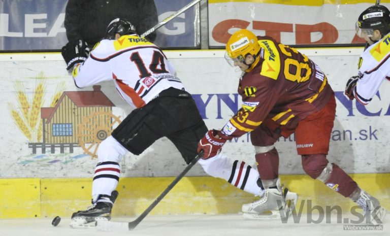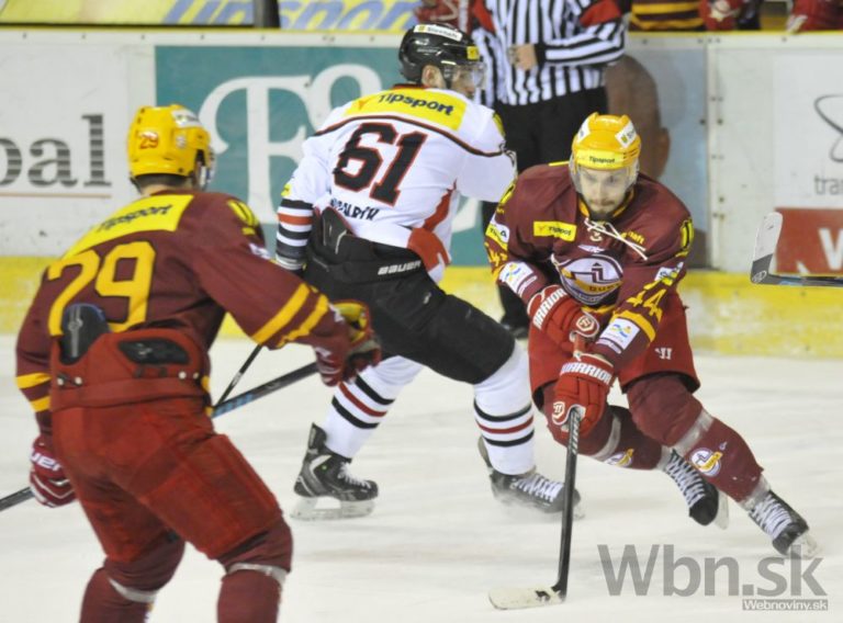 Zľava: Tomáš Daniška z Dukly Trenčín, Branislav Bendík z HC´05 Banská Bystrica a Denis Hudec z Dukly Trenčín počas 29. kola hokejovej Tipsport extraligy medzi Dukla Trenčín - HC Košice. Trenčín, 30. november 2014. Foto: SITA/Tomáš Somr