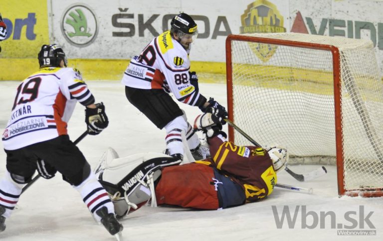 Sprava: Branislav Konrád z Dukly Trenčín, Patrick White a Milan Kytnár z HC´05 Banská Bystrica počas 29. kola hokejovej Tipsport extraligy medzi Dukla Trenčín - HC Košice. Trenčín, 30. november 2014. Foto: SITA/Tomáš Somr