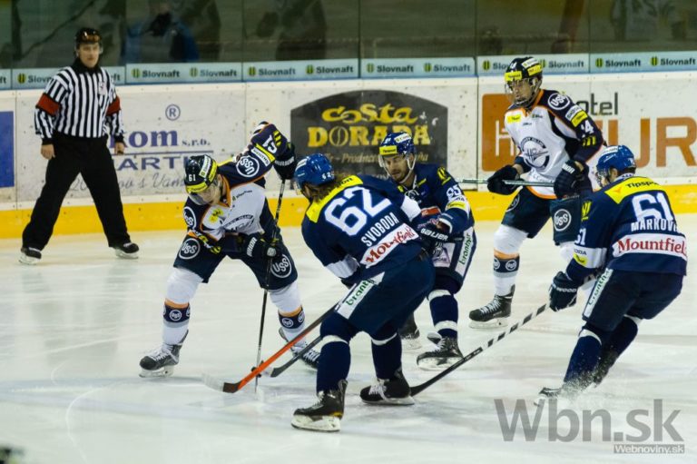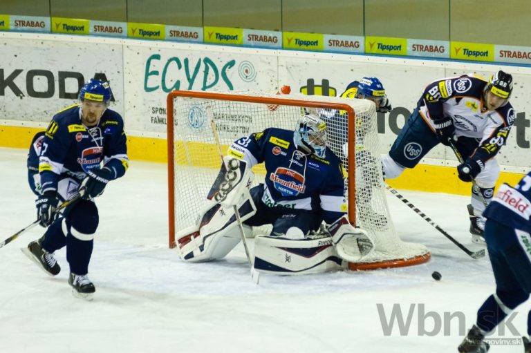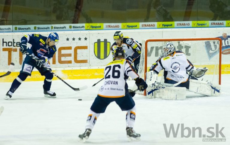 Zľava: Jaroslav Markovič z MHC Mountfield Martin, Matúš Chovan, Juraj Cebák a brankár Marcel Melicherčík, všetci z HK Košice, počas zápasu 29. kola Tipsport extraligy medzi MHC Mountfield Martin - HC Košice. Martin, 30. november 2014. Foto: SITA/Milo Fabian