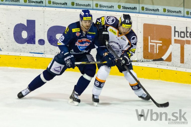 Zľava: Ivan Ďatelinka z MHC Mountfield Martin a Matej Češík z HK Košice počas zápasu 29. kola Tipsport extraligy medzi MHC Mountfield Martin - HC Košice. Martin, 30. november 2014. Foto: SITA/Milo Fabian