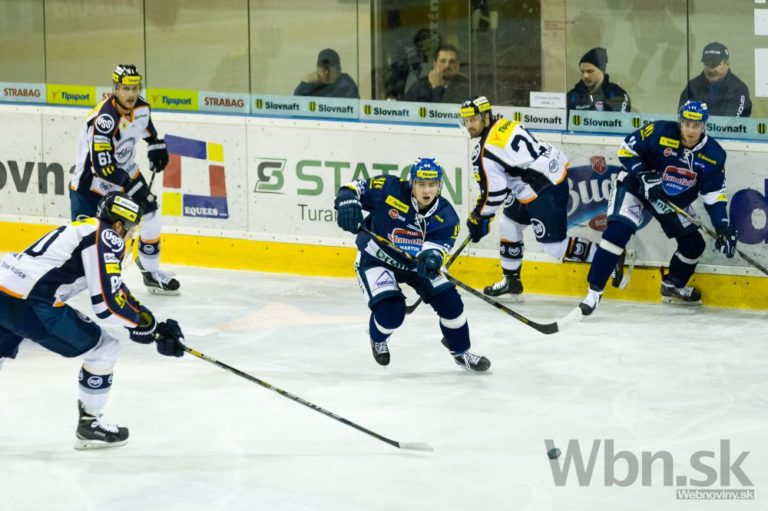 Zľava: Tomáš Hrnka a Marek Bartánus, obaja z HK Košice, Jaroslav Svoboda z MHC Mountfield Martin, Ivan Rachunek z HK Košice a Tomáš Brcko z MHC Mountfield Martin počas zápasu 29. kola Tipsport extraligy medzi MHC Mountfield Martin - HC Košice. Martin, 30. november 2014. Foto: SITA/Milo Fabian