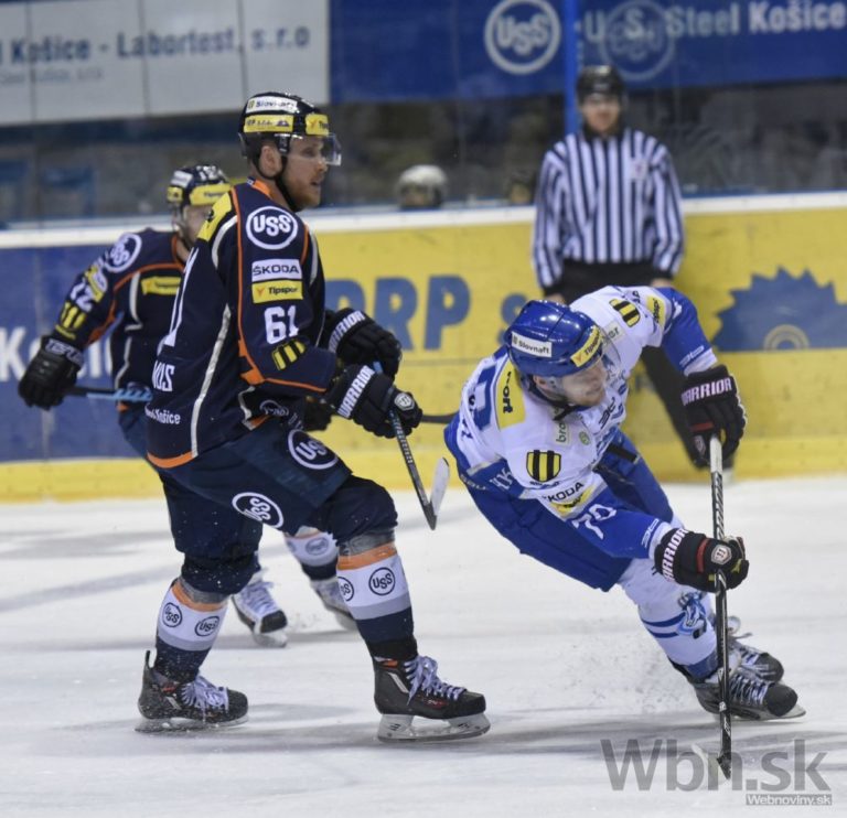 Zľava: Juraj Cebák z Košíc a Samuel Takáč z Popradu v piatom semifinálovom zápase medzi HC Košice - HK Poprad play off hokejovej Tipsport extraligy. Košice, 24. marec 2015. Foto: SITA/Tibor Zmak