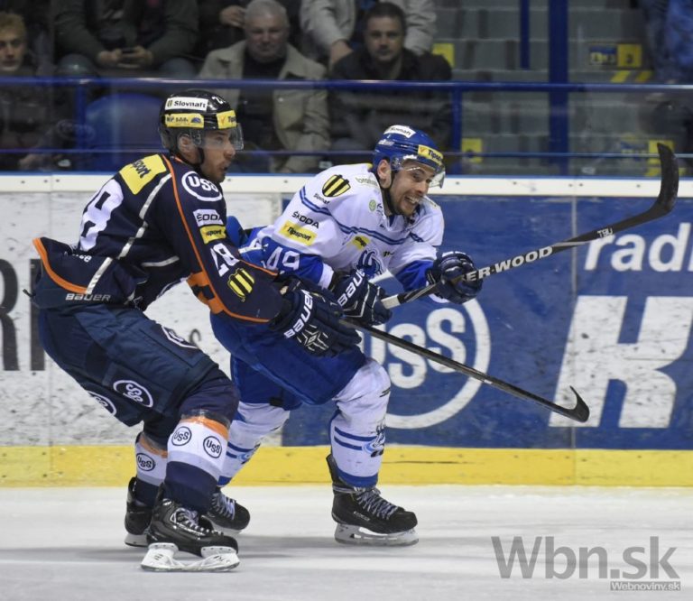Zľava: Lukáš Paukovček z Popradu a Radek Philipp z Košíc v piatom semifinálovom zápase medzi HC Košice - HK Poprad play off hokejovej Tipsport extraligy. Košice, 24. marec 2015. Foto: SITA/Tibor Zmak