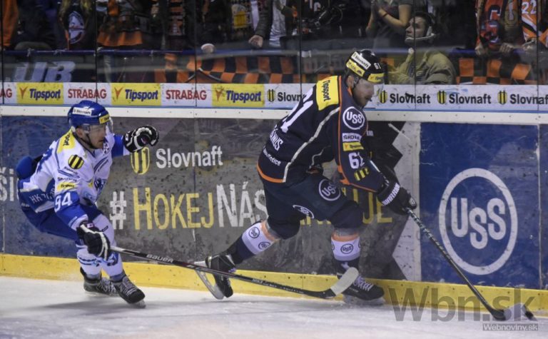Zľava: Ľubomír Dinda z Popradu a Marek Bartánus z Košíc v prvom semifinálovom zápase play-off hokejovej Tipsport extraligy medzi HC Košice - HK Poprad. Košice, 16. marec 2015. Foto: SITA/Tibor Zmak