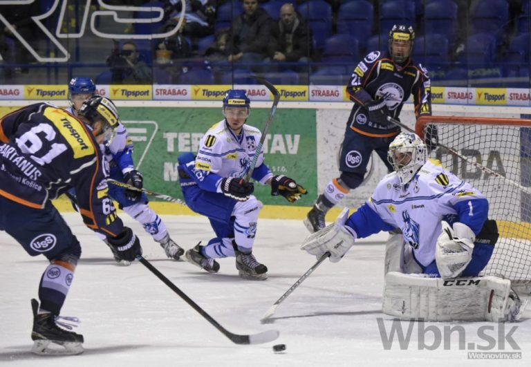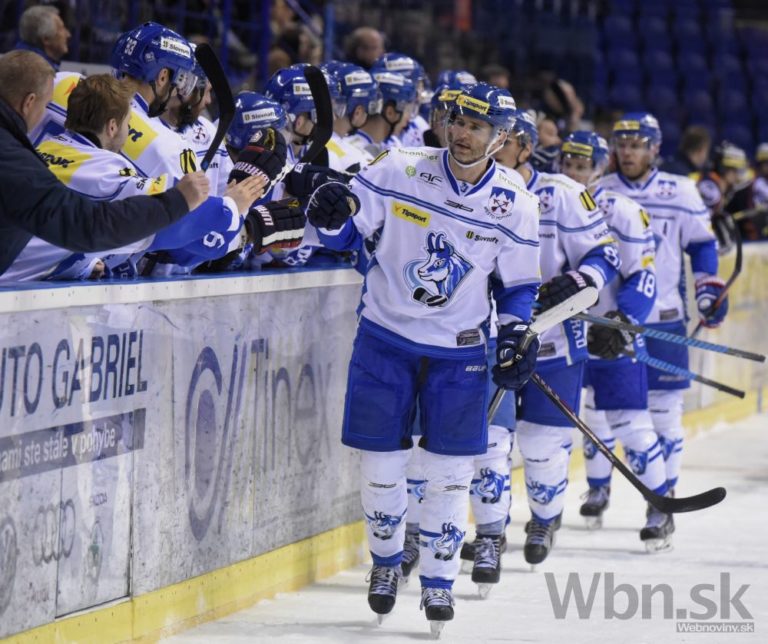 Popradskí hráči oslavujú gól v prvom semifinálovom zápase play-off hokejovej Tipsport extraligy medzi HC Košice - HK Poprad. Košice, 16. marec 2015. Foto: SITA/Tibor Zmak