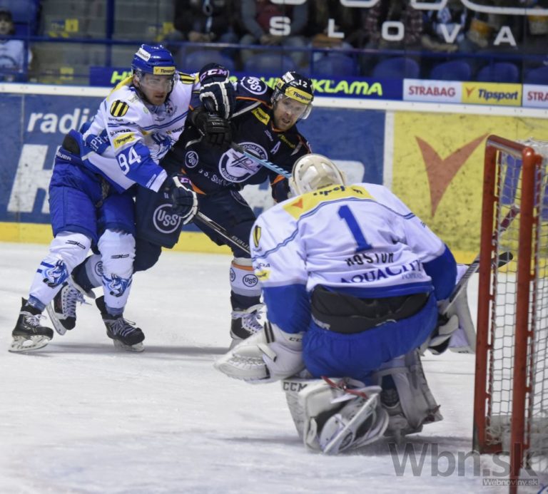 Zľava: Ľubomír Dinda z Popradu, Jiří Bicek z Košíc a Matúš Kostúr z Popradu v prvom semifinálovom zápase play-off hokejovej Tipsport extraligy medzi HC Košice - HK Poprad. Košice, 16. marec 2015. Foto: SITA/Tibor Zmak