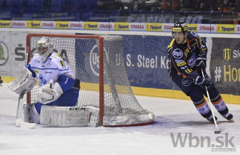 Zľava: Matúš Kostúr z Popradu a Gabriel Spilar z Košíc v prvom semifinálovom zápase play-off hokejovej Tipsport extraligy medzi HC Košice - HK Poprad. Košice, 16. marec 2015. Foto: SITA/Tibor Zmak