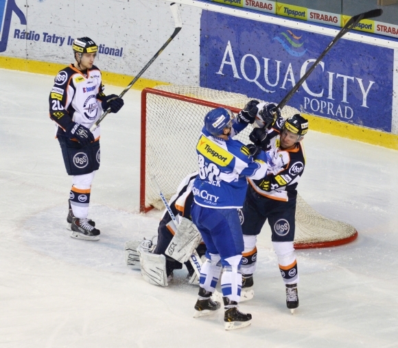 Dušan Sidor z HK Poprad (uprostred) a Miroslav Macejko z HK Košice (uprostred vpravo) počas hokejového zápasu 28. kola Tipsport extraligy 2013/2014, HK Poprad – HC Košice. Poprad, 6. december 2013. Foto: SITA/Radoslav Maťaš