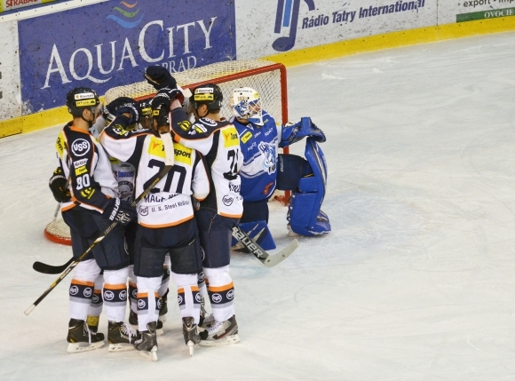 Radosť hráčov z HC Košice počas hokejového zápasu 28. kola Tipsport extraligy 2013/2014, HK Poprad – HC Košice. Poprad, 6. december 2013. Foto: SITA/Radoslav Maťaš
