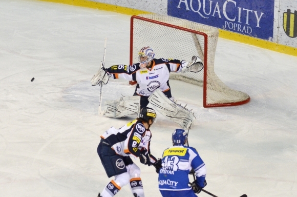 Alexandr Hylák z HC Košice (v pozadí) počas hokejového zápasu 28. kola Tipsport extraligy 2013/2014, HK Poprad – HC Košice. Poprad, 6. december 2013. Foto: SITA/Radoslav Maťaš