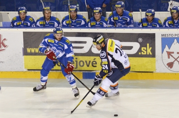 Zľava: Adam Lapšanský z HK Poprad a Tomáš Klouček z HC Košice počas hokejového zápasu 28. kola Tipsport extraligy 2013/2014, HK Poprad – HC Košice. Poprad, 6. december 2013. Foto: SITA/Radoslav Maťaš