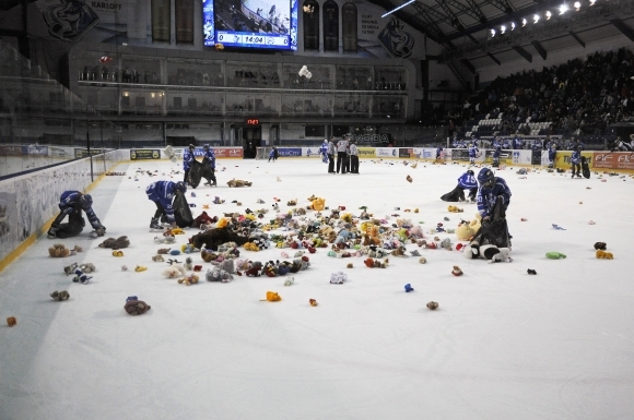 Plyšové hračky od fanúšikov na ľade počas hokejového zápasu 28. kola Tipsport extraligy 2013/2014, HK Poprad – HC Košice. Poprad, 6. december 2013. Foto: SITA/Radoslav Maťaš