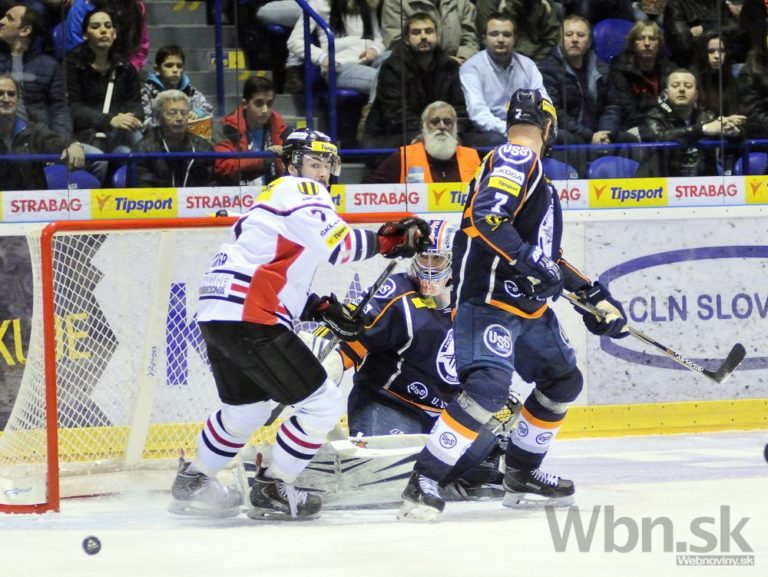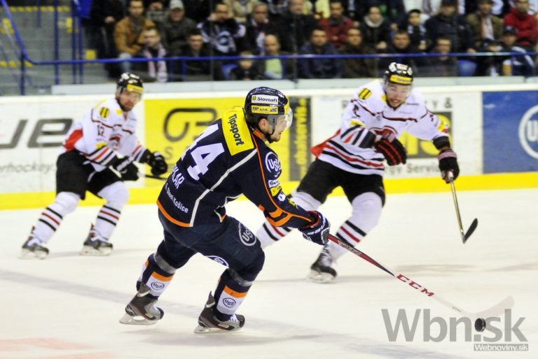 Hráč HC Košice Peter Bartoš (v pozadí vľavo) počas prvého finálového zápasu Slovnaft play-off Tipsport extraligy medzi HC Košice - HC '05 Banská Bystrica. Košice, 1. apríl 2015. Foto: SITA/Jozef Jarošík