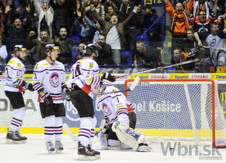 Autor prvého gólu Jakub Suja (druhý zľava) z HC Košice a radosť fanúšikov domácich počas prvého finálového zápasu Slovnaft play-off Tipsport extraligy medzi HC Košice - HC '05 Banská Bystrica. Košice, 1. apríl 2015. Foto: SITA/Jozef Jarošík