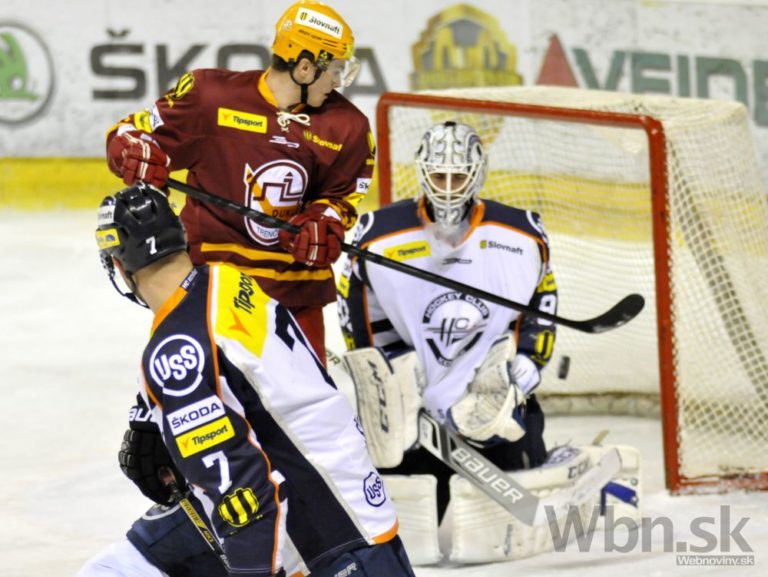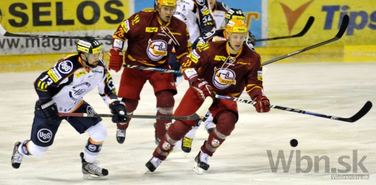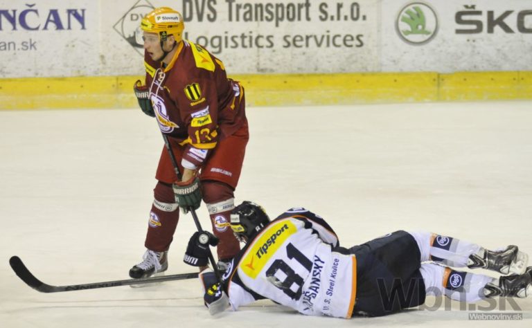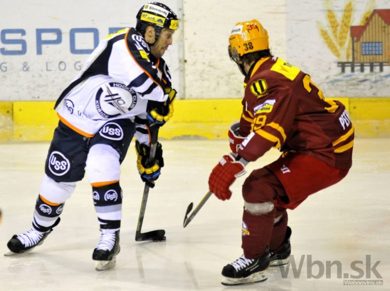 Sprava: Róbert Petrovický z Dukly Trenčín a Ivan Rachunek z HC Košice počas 28. kola hokejovej Tipsport extraligy medzi Dukla Trenčín a HC Košice. Trenčín, 28. november 2014. Foto: SITA/Tomáš Somr