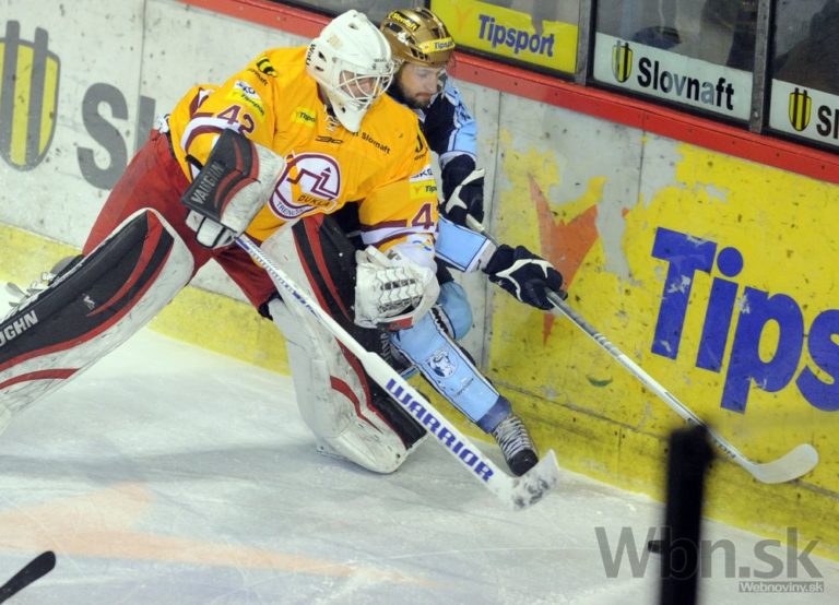 Henrich Ručkay z HK Nitra (vpravo) a brankár Branislav Konrád z Dukla Trenčín (vľavo) počas 52. kola slovenskej hokejovej Tipsport extraligy 2014/2015 medzi HK Nitra - Dukla Trenčín. Nitra, 20. február 2015. Foto: SITA/Martin Havran