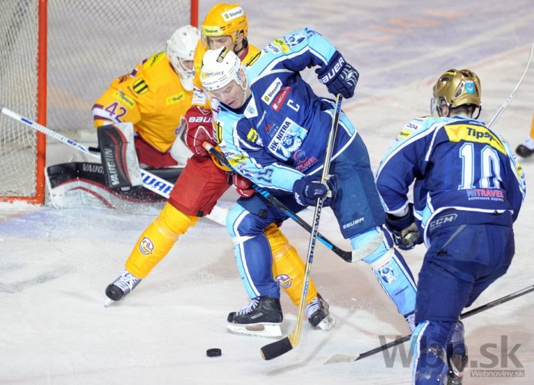 Jozef Stumpel z HK Nitra (druhý sprava) počas 52. kola slovenskej hokejovej Tipsport extraligy 2014/2015 medzi HK Nitra - Dukla Trenčín. Nitra, 20. február 2015. Foto: SITA/Martin Havran