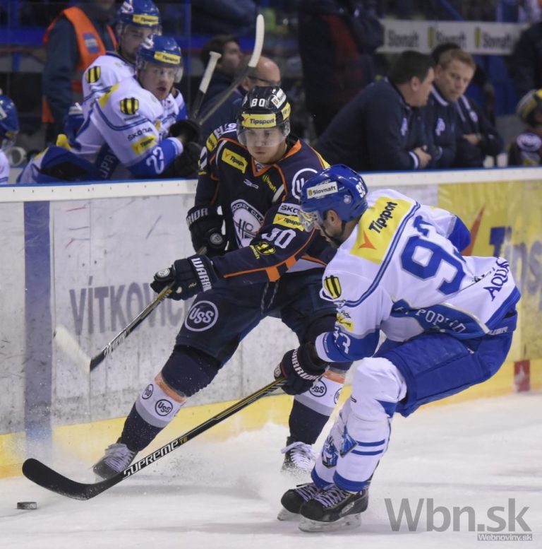 Zľava: Tomáš Hrnka z Košíc a Jakub Makovský z Popradu v zápase 52. kola hokejovej Tipsport extraligy medzi HC Košice - HK Poprad. Košice, 20. február 2015. Foto: SITA/Tibor Zmak