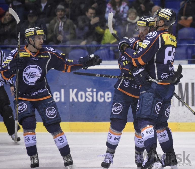 Radosť z gólu košických hráčov v zápase 52. kola hokejovej Tipsport extraligy medzi HC Košice - HK Poprad. Košice, 20. február 2015. Foto: SITA/Tibor Zmak