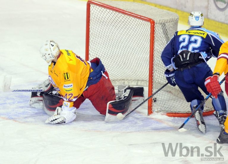 Roman Tománek z HK Nitra (vpravo) a brankár Branislav Konrád z Dukla Trenčín (vľavo) počas 52. kola slovenskej hokejovej Tipsport extraligy 2014/2015 medzi HK Nitra - Dukla Trenčín. Nitra, 20. február 2015. Foto: SITA/Martin Havran